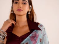 This aqua blue lurex brasso saree features elegant floral patterns with a soft drape, paired with a contrasting Wine natural silk blouse for a refined and classy look. Perfect for festive and party wear.