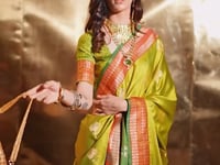 Radiate elegance in avocado green satin handloom weaving silk saree adorned with zari weaving and chaap border. Paired perfectly with a matching blouse featuring zari and chaap border work.