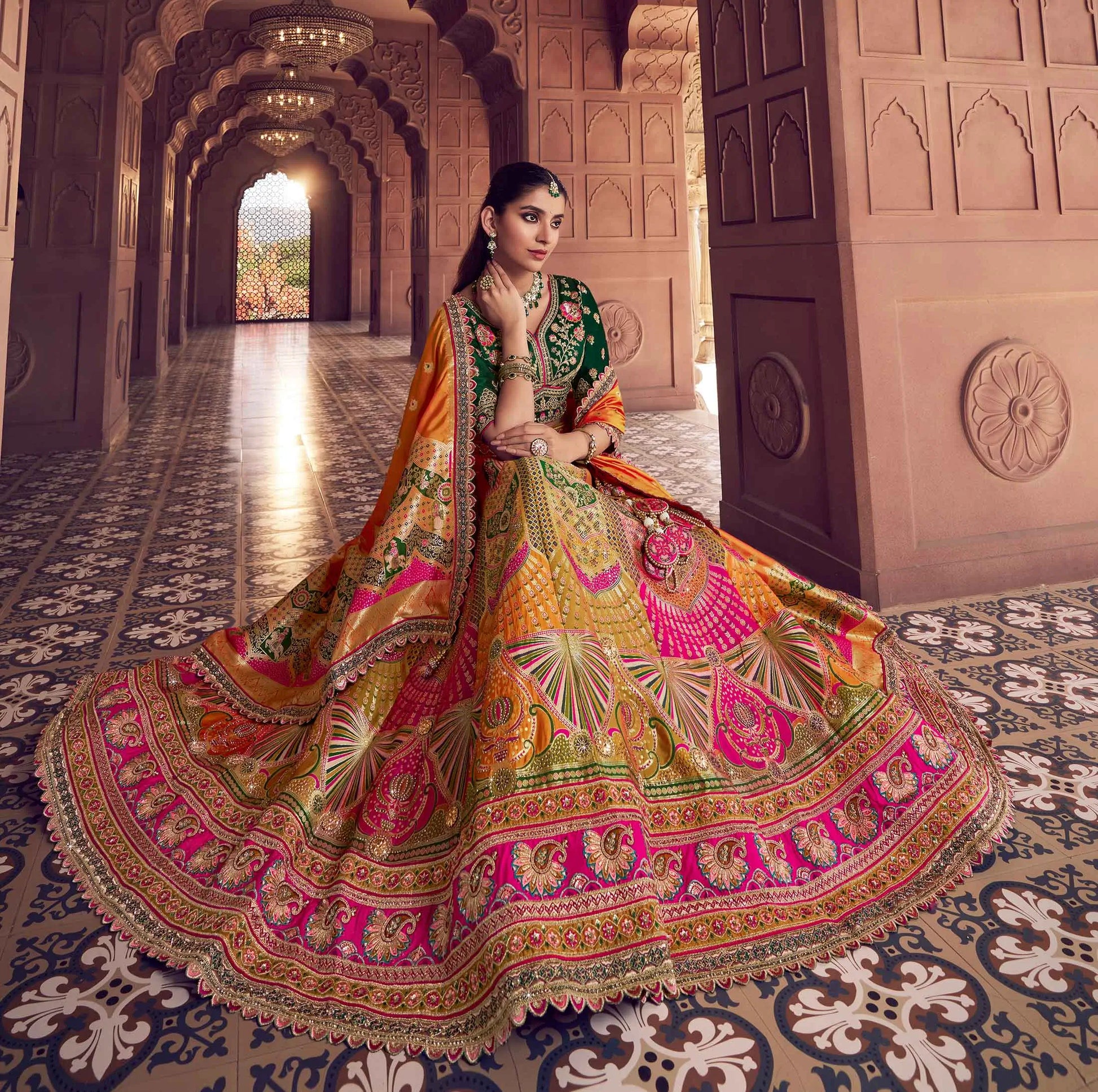 Explore our new Bridal Lehenga Collection in rich banarasi silk, adorned with sequins, swaroski and zari embroidery. Paired with a matching blouse and dupatta—it’s perfect for an elegant bridal look.