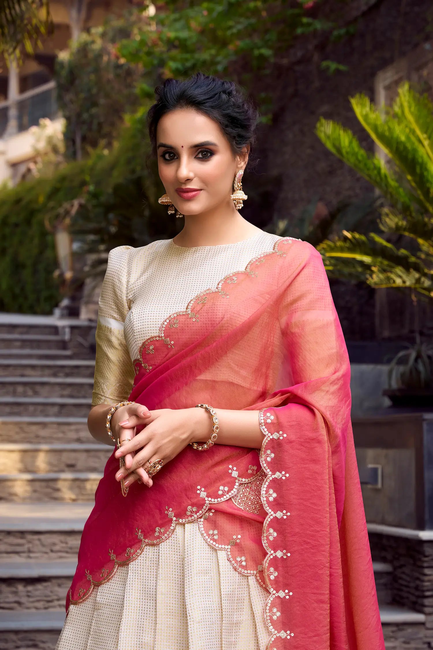 Beige Jacquard Chex Lehenga Choli With Zari Weaving Work & Sequins Embroidery