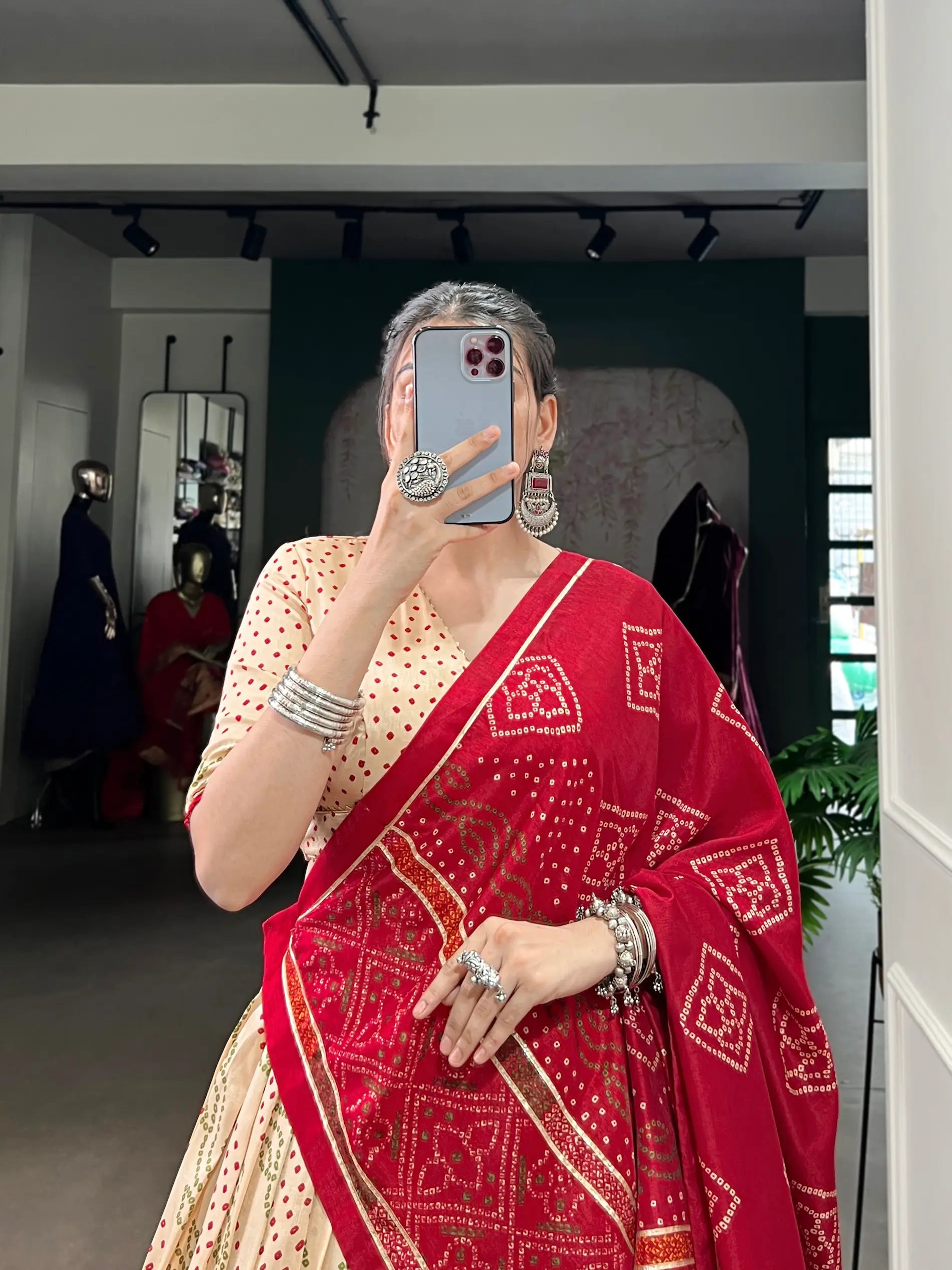 Brighten your Navratri look with this beige tasar silk lehenga, featuring vibrant bandhej print and gotta patti lace. Paired with a matching blouse and contrasting red dupatta, it adds a festive flair to your traditional ensemble.