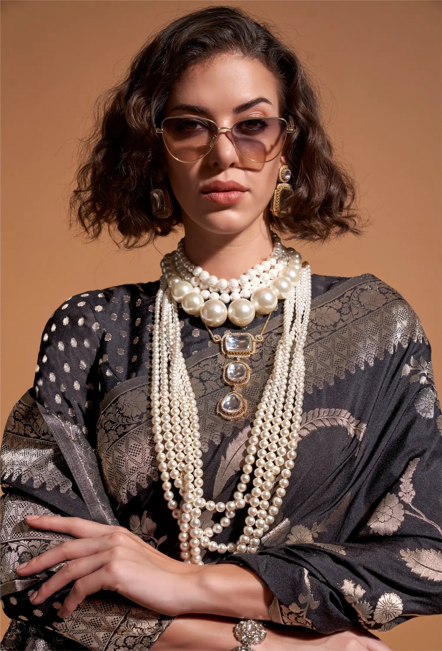 Graceful black saree in georgette handloom weaving silk with intricate zari weaving work, complemented by a matching georgette nylon weaving silk blouse featuring rich zari craftsmanship.