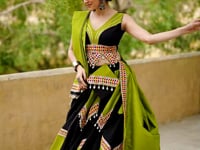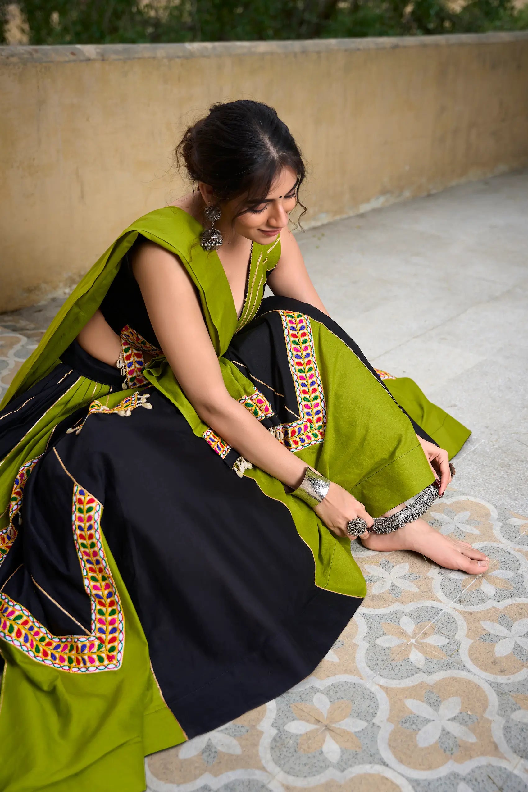 Traditional black and parrot green Navratri lehenga in pure cotton with 6-meter flair, gamthi work, gotta patti, and cowrie (kodi) lace detailing. Matching blouse and dupatta carry the same intricate embellishments for a cohesive festive look.