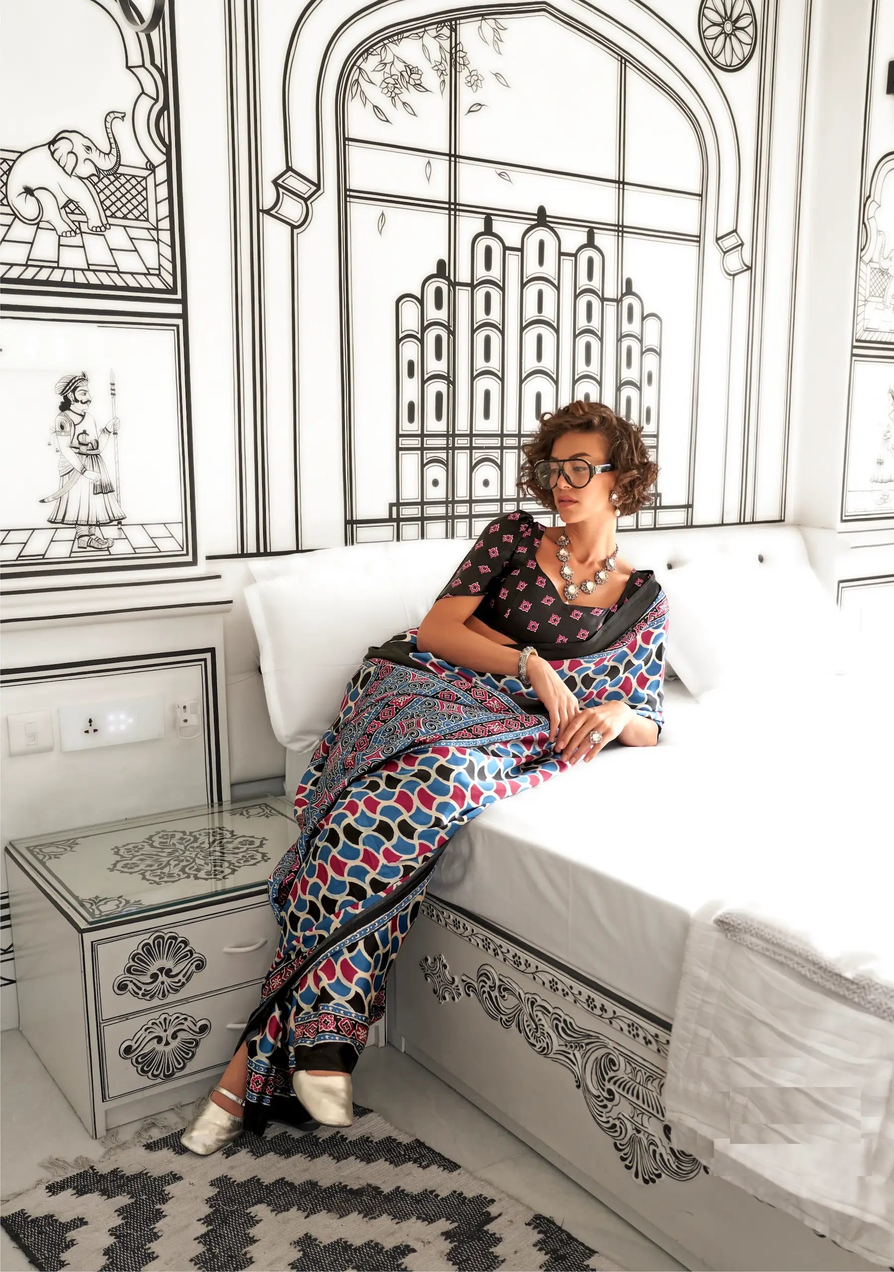 This elegant multicolor satin crepe saree features exquisite Ajrakh print. Paired with a black blouse in matching print, it creates a striking contrast perfect for festive celebrations and cultural gatherings.