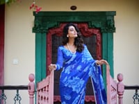 Blue Chiffon Saree With Floral Print & Pearl Lace Border