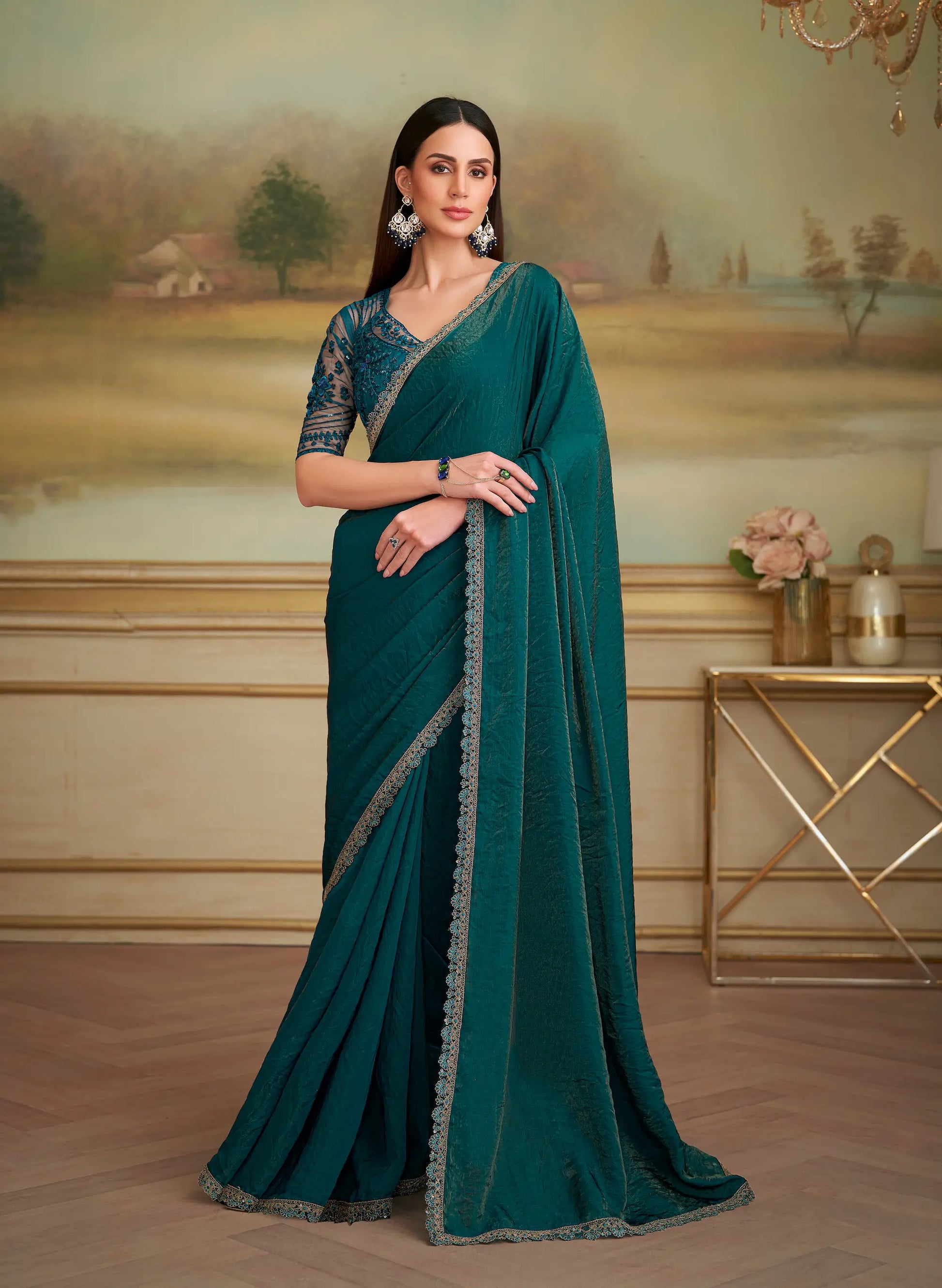 A graceful bottle green twilight georgette saree with beautifully detailed thread & sequins embroidery border. Paired with matching blouse adorned with matching embroidery for an elegant festive look.