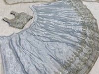 A stylish cloud grey satin silk lehenga adorned with zari, dori, and sequins embroidery. Paired with a matching blouse and a net dupatta for a sophisticated festive look.