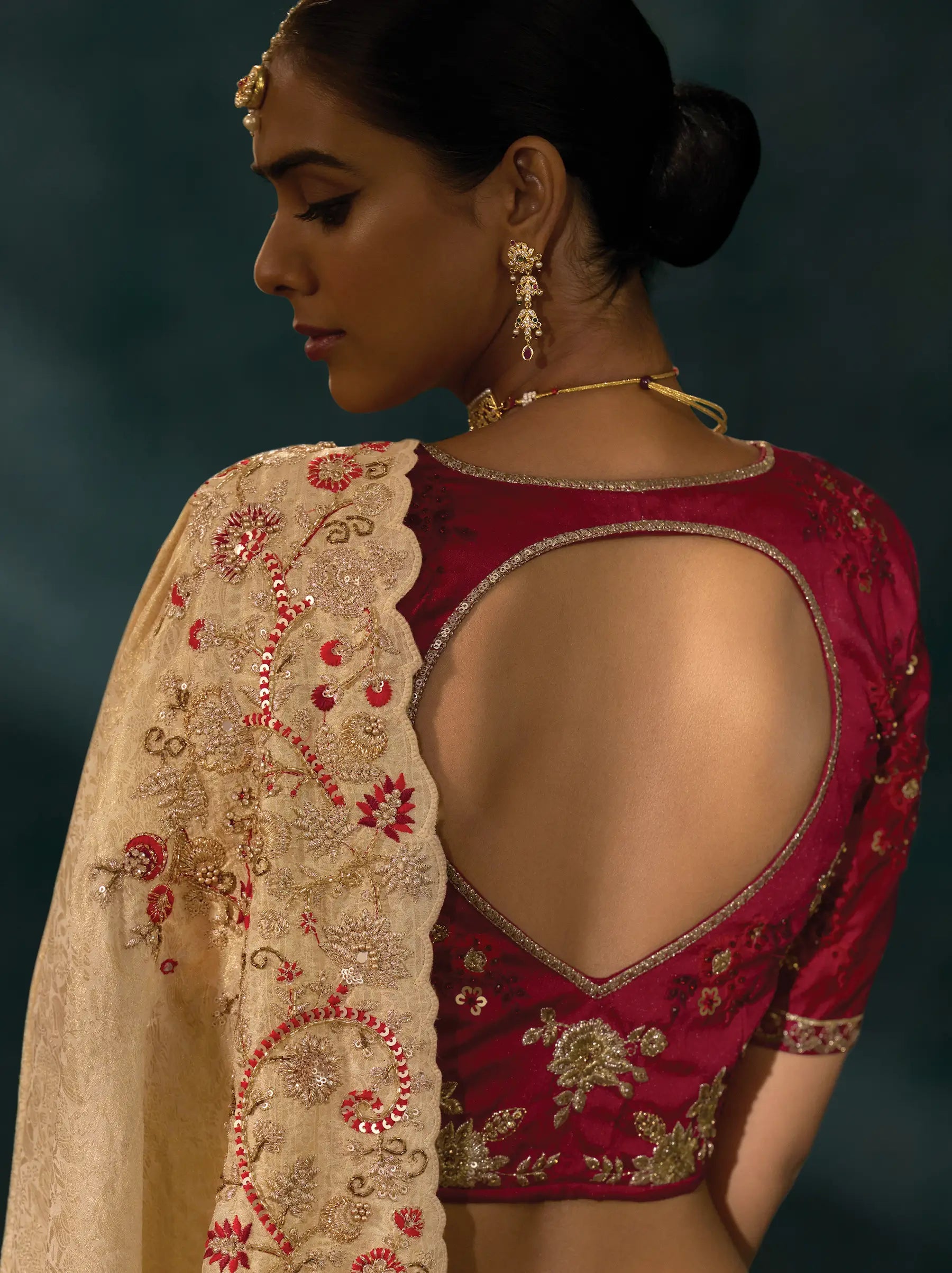 Luxurious dark beige pure ziraf silk saree shines with heavy zari, thread, sequins, cut dana, mirror, stone, moti work, and cutwork border with tassels. Paired with a rose red pure silk blouse, it creates a regal look perfect for weddings and grand festivities.