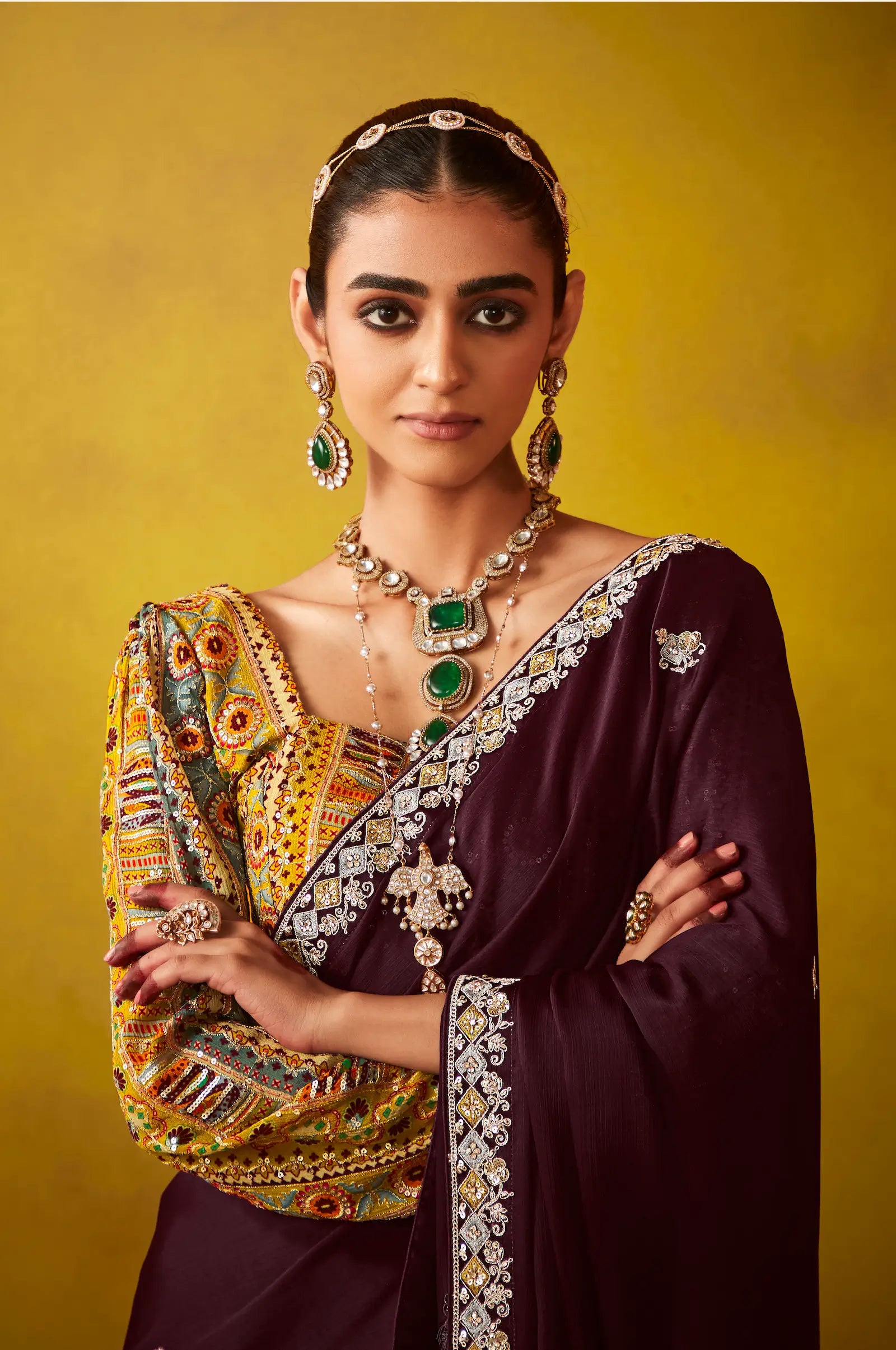 Dark Brown Glass Tissue Saree With Digital Print, Sequence & Thread Embroidery Work