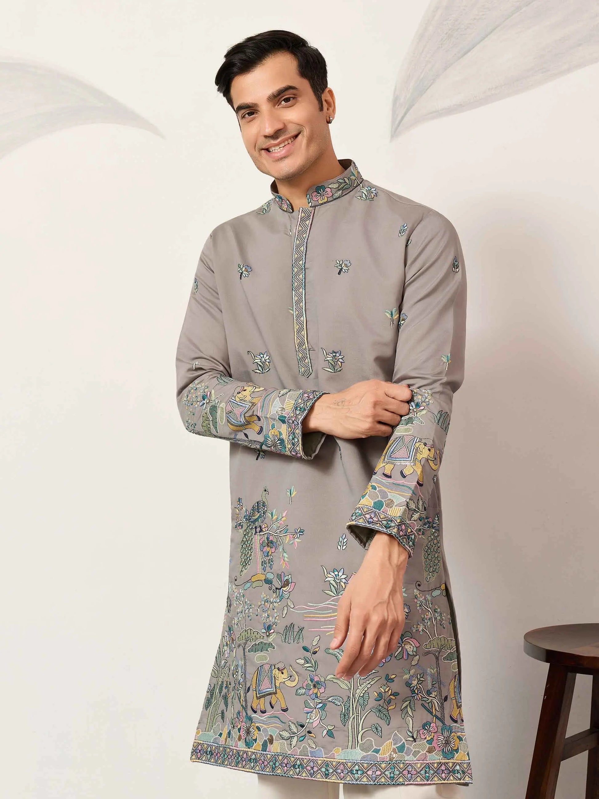 Celebrate Festivals in style with our new men’s kurta set. The kurta, crafted in luxurious viscose silk, features intricate thread, sequins embroidery work, paired with comfortable silk pants—perfect for festivals, parties, and traditional occasions.