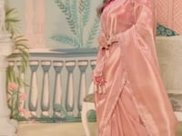This dusty pink zari organza silk saree crafted with zari & sequins embroidery, hand work, cutwork border and tassels. Paired with a hot pink silk blouse, it exudes rich elegance for weddings and festive occasions.