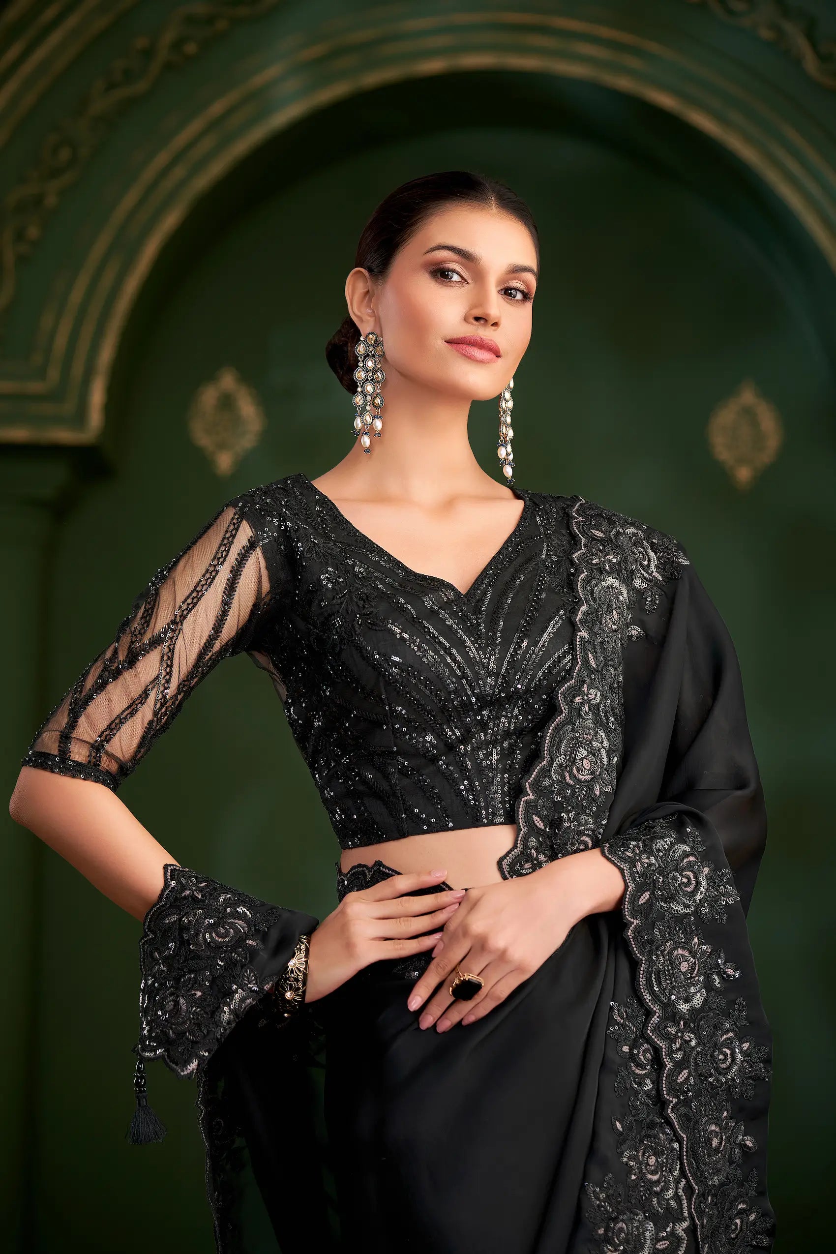A stunning hot black saree in satin georgette, adorned with intricate embroidery, an elegant cut-work border and tassels. Paired with matching satin blouse for a refined festive look.
