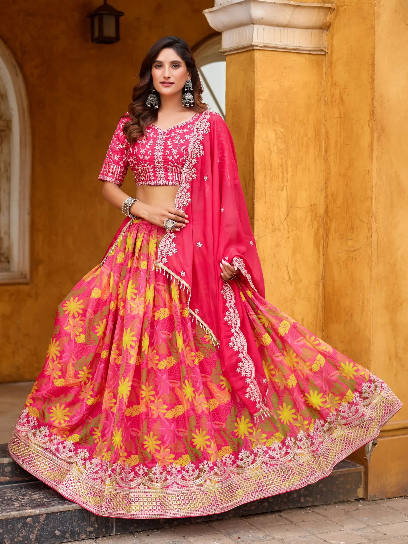Hot Pink Taby Silk Floral Print & Embroidery Work Lehenga Choli