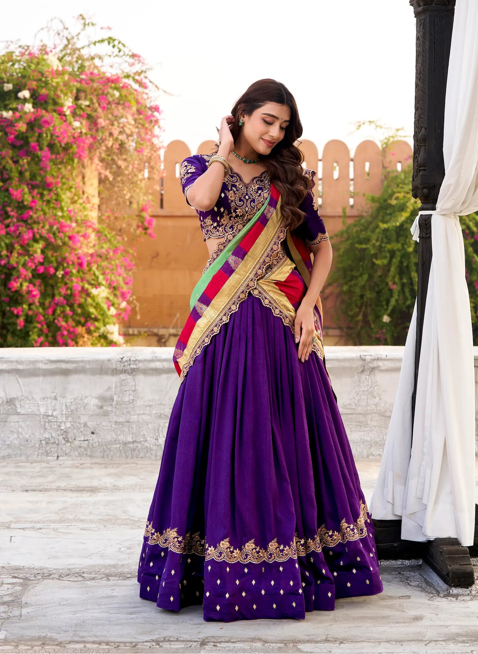 A graceful iris purple Vichitra silk lehenga adorned with rich embroidery. Paired with a matching embroidered blouse and a sea green multicolor dupatta for a vibrant festive finish.