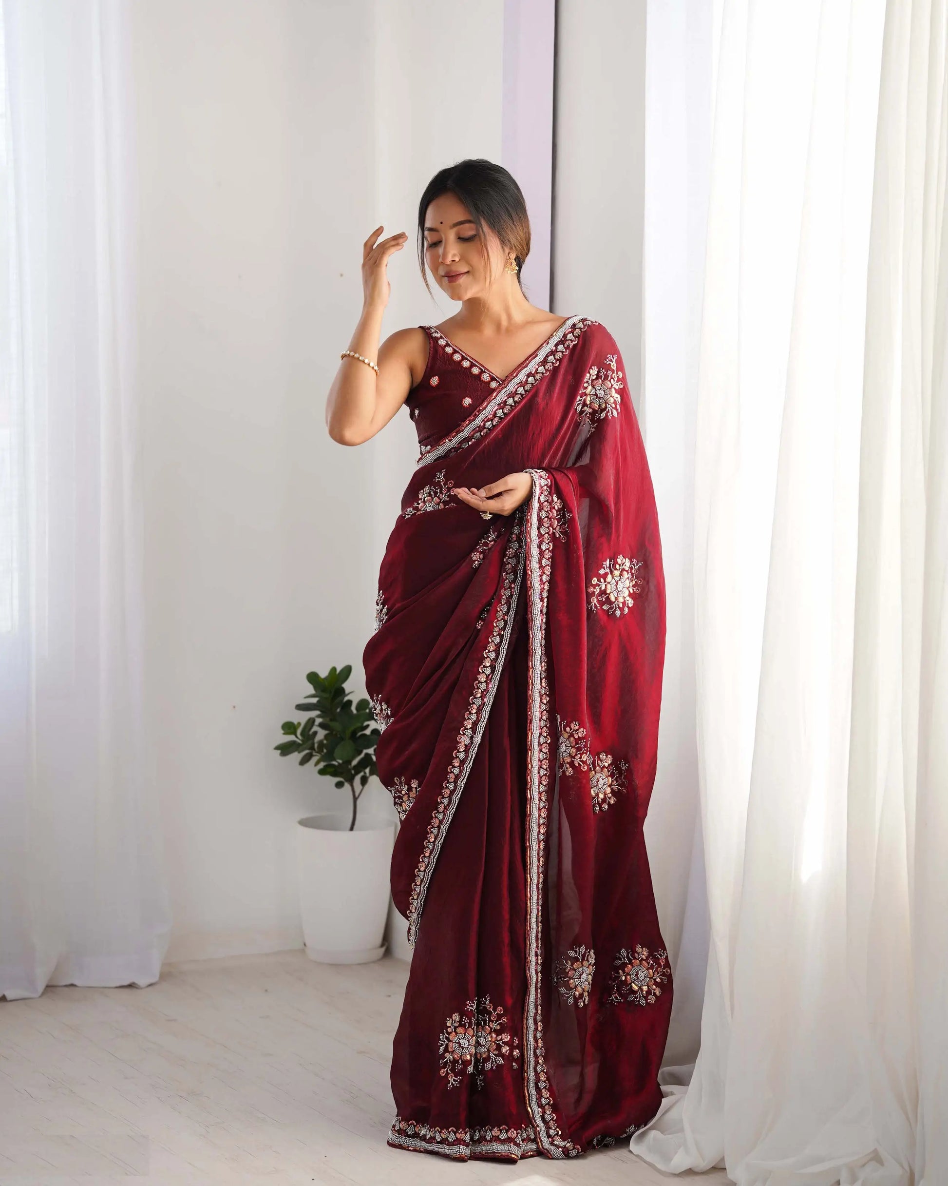 Make a bold statement with this maroon Fendi satin saree, featuring elegant designer beads hand work. Paired with a matching blouse, it exudes rich charm and graceful sophistication.