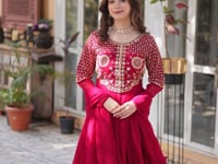Our Unique Gown Collection is designed to make a statement. Crafted from faux blooming georgette fabric, each gown offers a luxurious yet comfortable feel. Vibrant embroidery work and a same fabric dupatta with border gathering add a touch of elegance. Perfect for weddings, festivals, or any special occasion, this collection blends style with ease effortlessly.