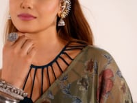 This Olive Green lurex brasso saree features elegant floral patterns with a soft drape, paired with a contrasting timber green natural silk blouse for a refined and classy look. Perfect for festive and party wear.