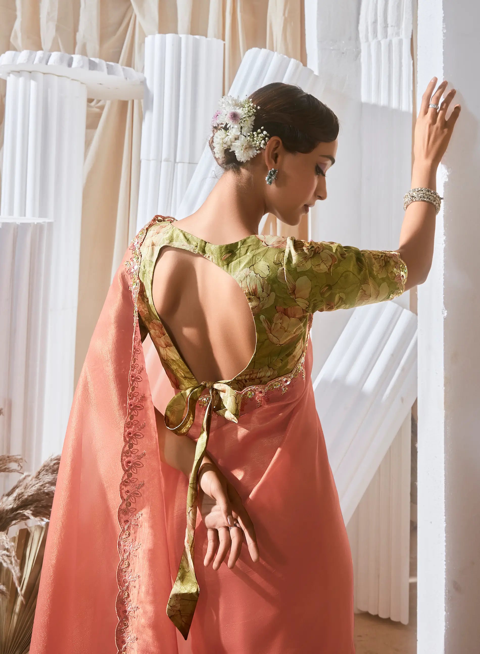 This elegant peach fancy tissue saree adorned with thread & sequins embroidery, cut work border. Paired with matching blouse featuring digital print and embroidery, it makes a perfect choice for weddings and festive occasions.