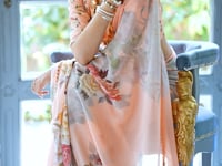 Peach Georgette Floral Print & Pearl Lace Border Saree