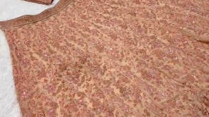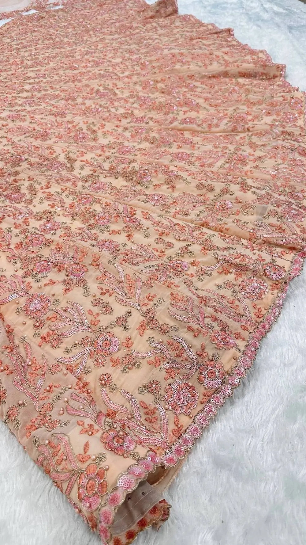 This graceful peach lehenga in georgette is adorned with dori, thread, and sequins embroidery with pearl bead work. The matching georgette blouse and net dupatta completes the look, making it a perfect choice for weddings and festive occasions.