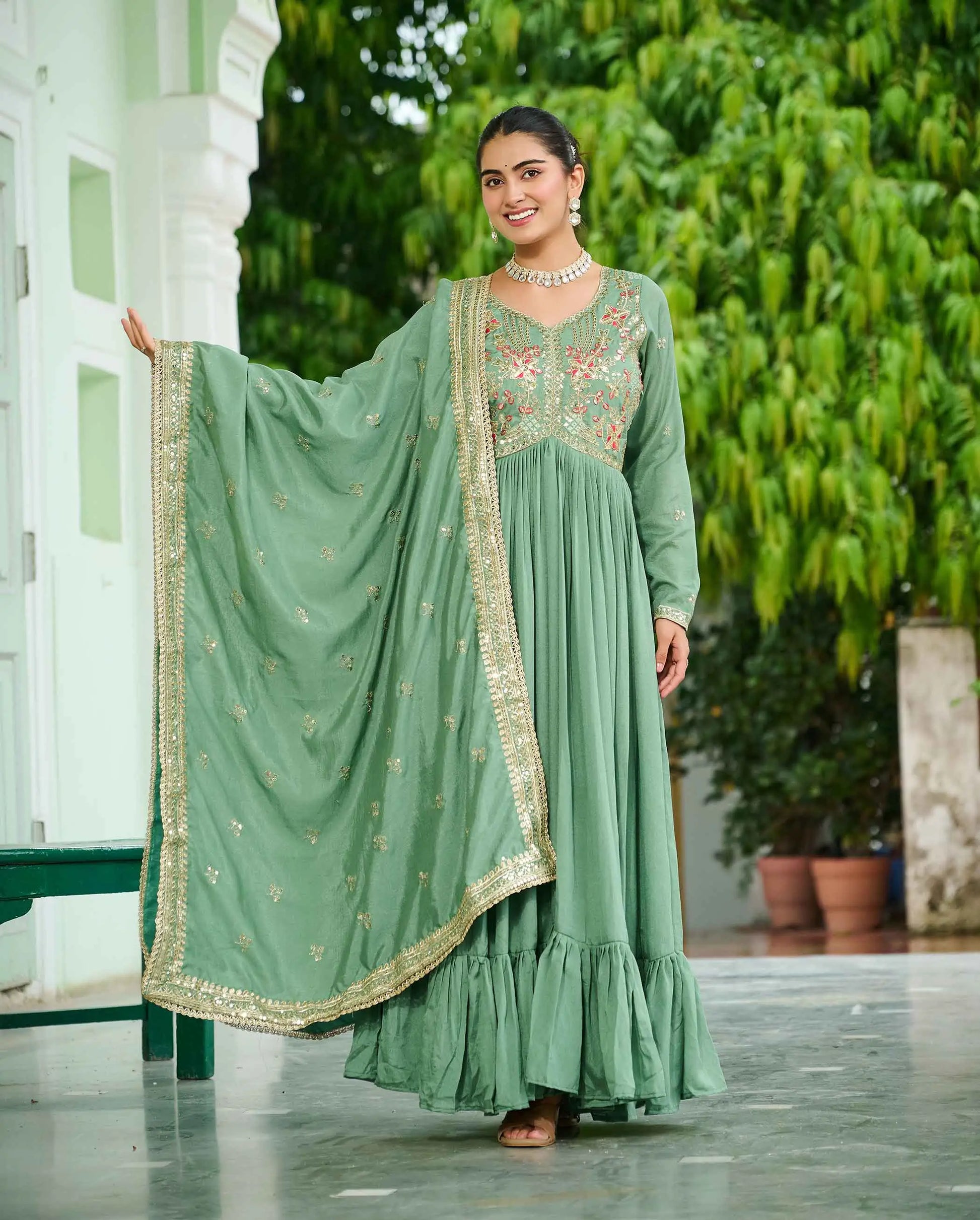 We are thrilled to unveil our latest Gown Collection, Crafted from vichitra silk fabric. Vibrant embroidery work add a touch of elegance. Perfect for weddings, festivals, or any special occasion, this collection blends style with ease effortlessly.