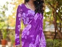 Purple Chiffon Saree With Floral Print & Pearl Lace Border