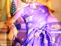 Elegant purple pure satin handloom silk saree with intricate zari weaving, complemented by a matching brocade blouse, perfect for festive and ethnic wear.