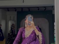 Elegant purple salwar suit in Vichitra silk, highlighted with sequins and thread embroidery on the top and dupatta. Comes with a plain matching bottom—ideal for festive wear.