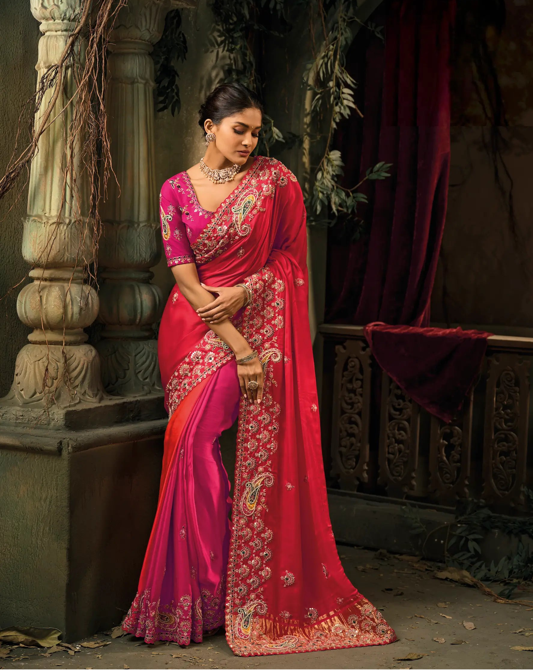 Rani Pink Silk Heavy Embroidery Saree