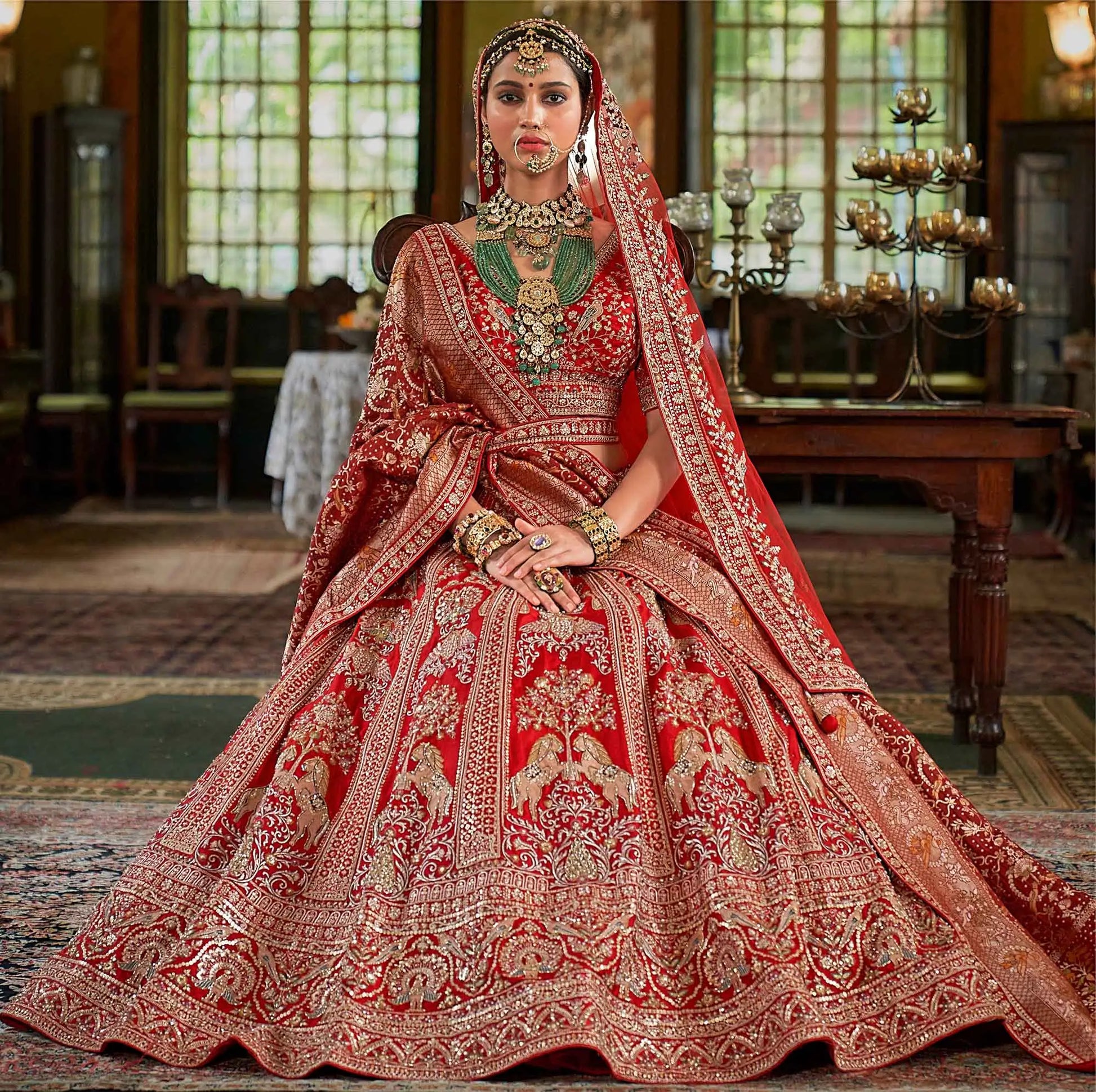 Red Bridal Lehenga Featuring Rich Embroidery & Pearl