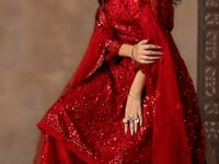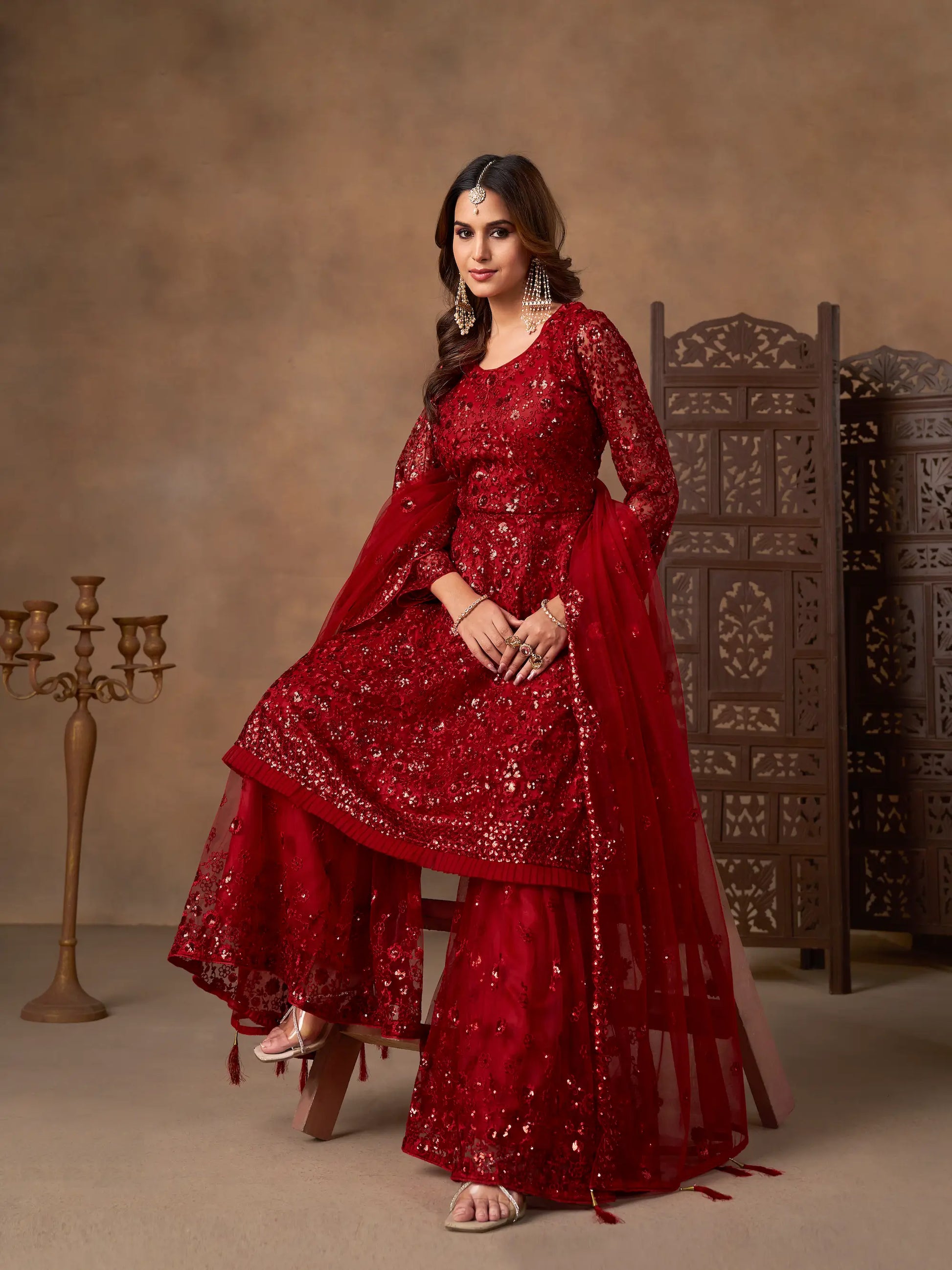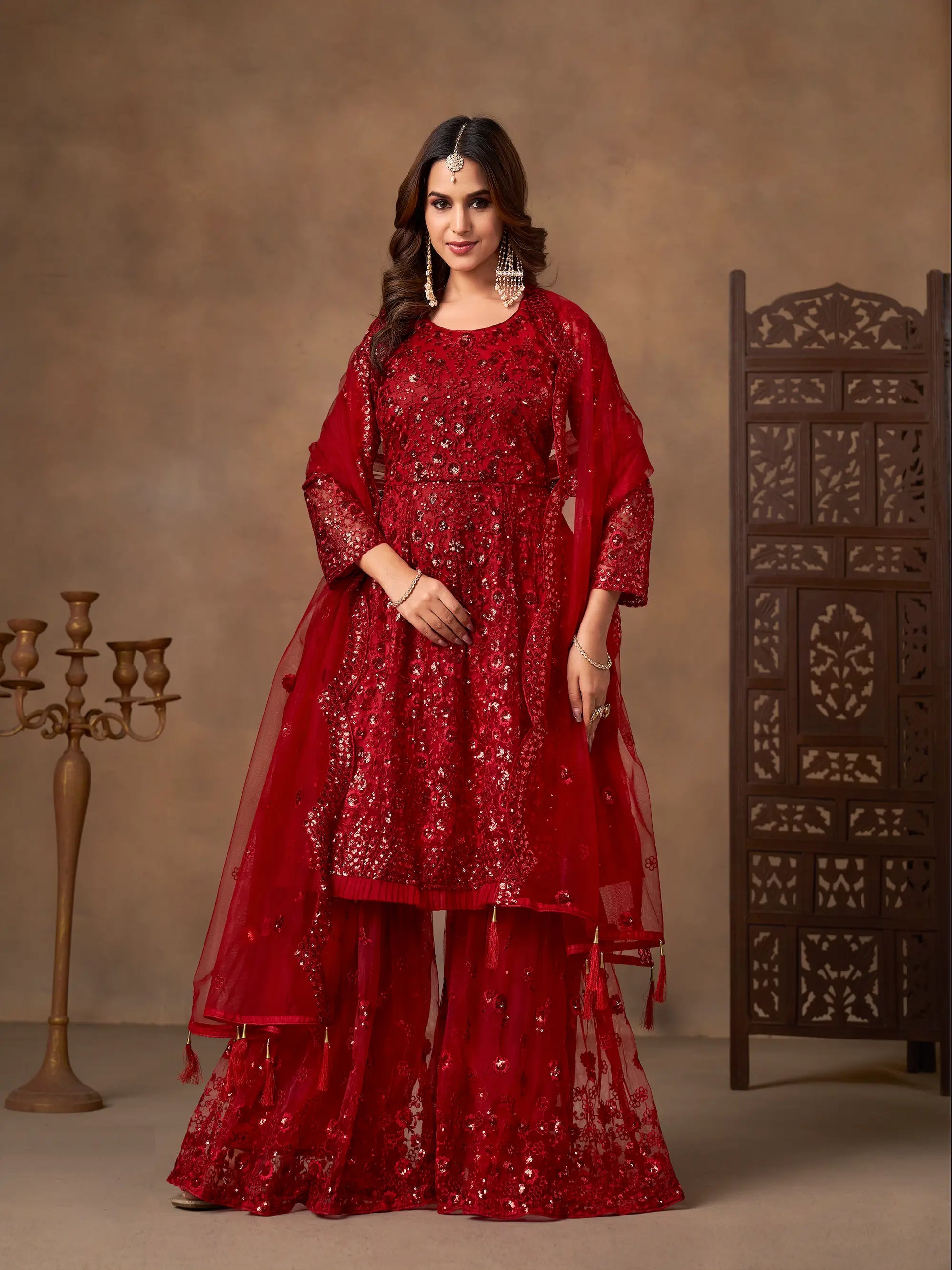 This red net palazzo set features thread and sequins embroidery on the top and sharara. Paired with a matching embroidered dupatta, it creates an elegant and stylish ensemble.