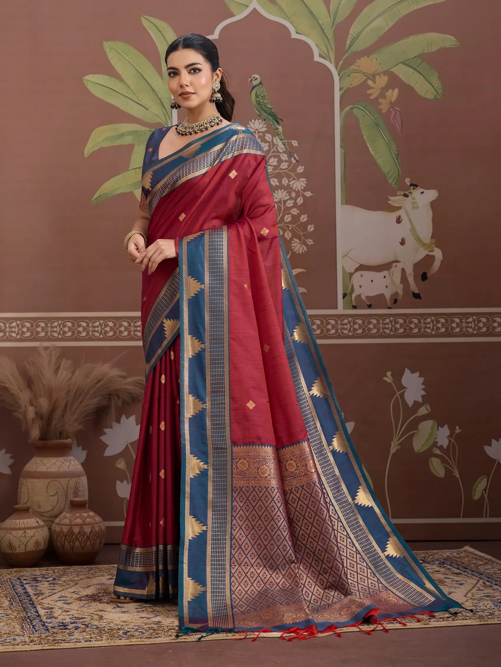 A classic rich maroon tussar silk saree with rich zari weaving, paired with a slate blue blouse finished in matching zari work for a striking, elegant look.