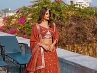 A graceful rust orange lehenga crafted in chocolate crush fabric, adorned with delicate thread & sequins embroidery. Paired with a matching blouse and dupatta, it’s perfect for festive and celebratory occasions.