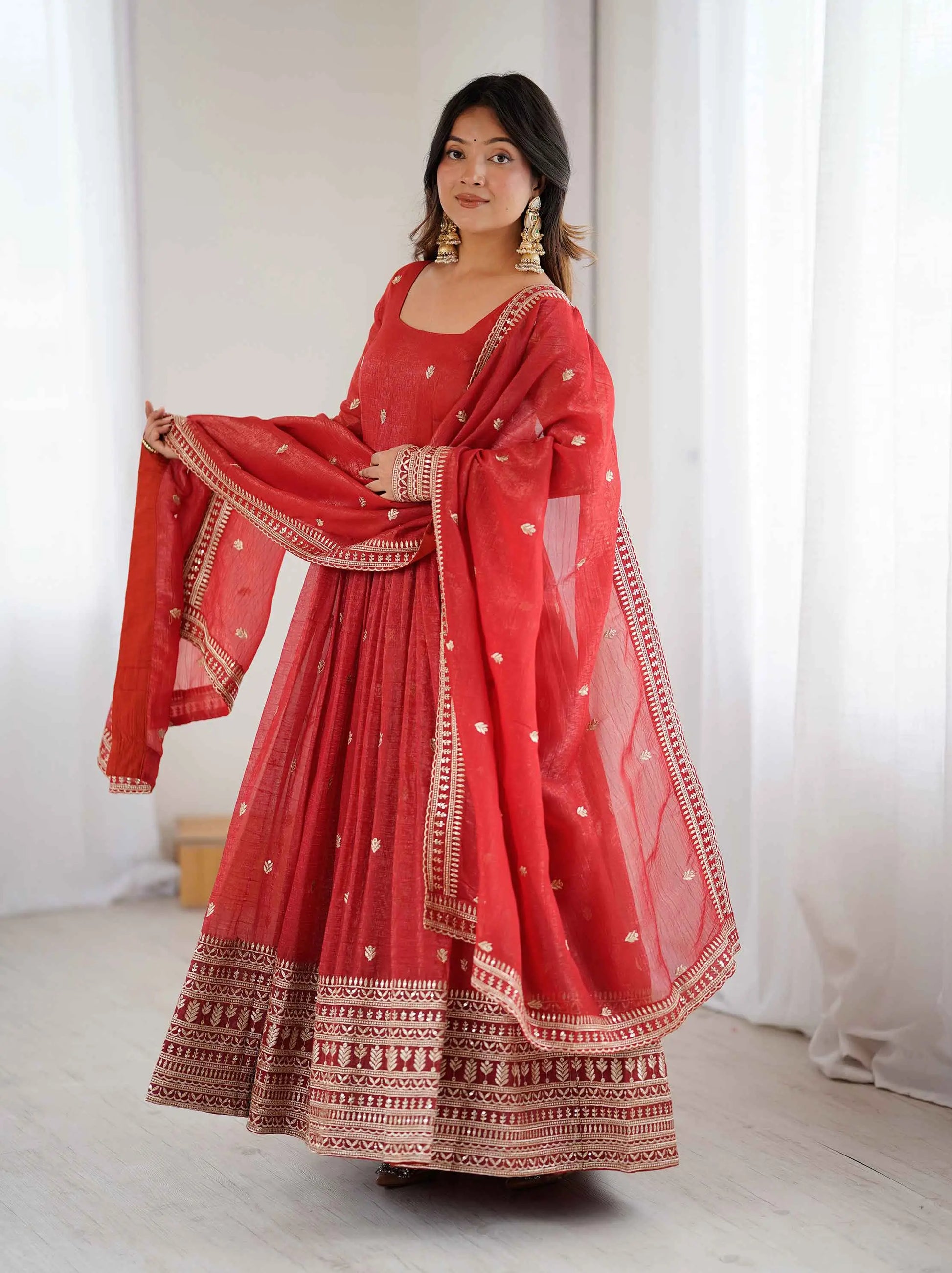 Stand out in style this season with our elegant gown collection, crafted from crunchy silk featuring elegant embroidery work. Paired with a dupatta, this ensemble is perfect for festive occasions and celebrations.  Stay tuned for the launch!