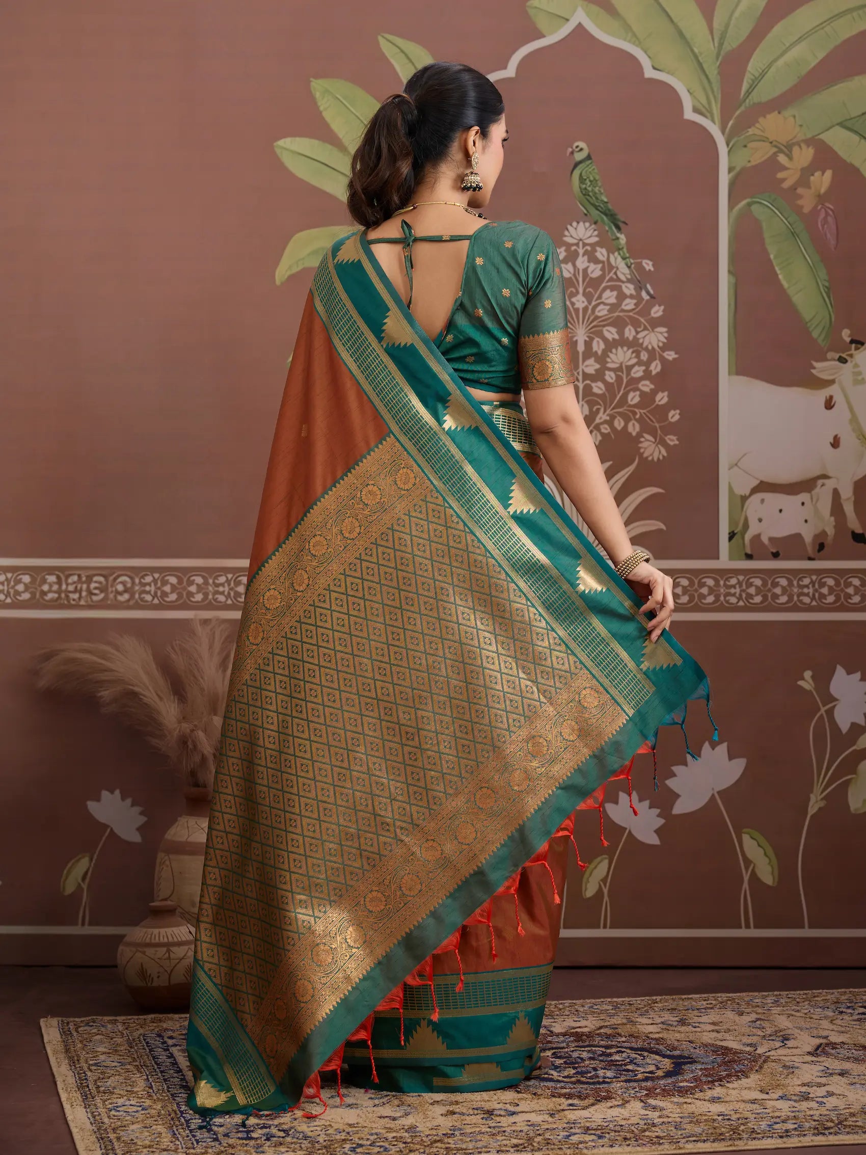 A classic rust orange tussar silk saree with rich zari weaving, paired with a forest green blouse finished in matching zari work for a striking, elegant look.