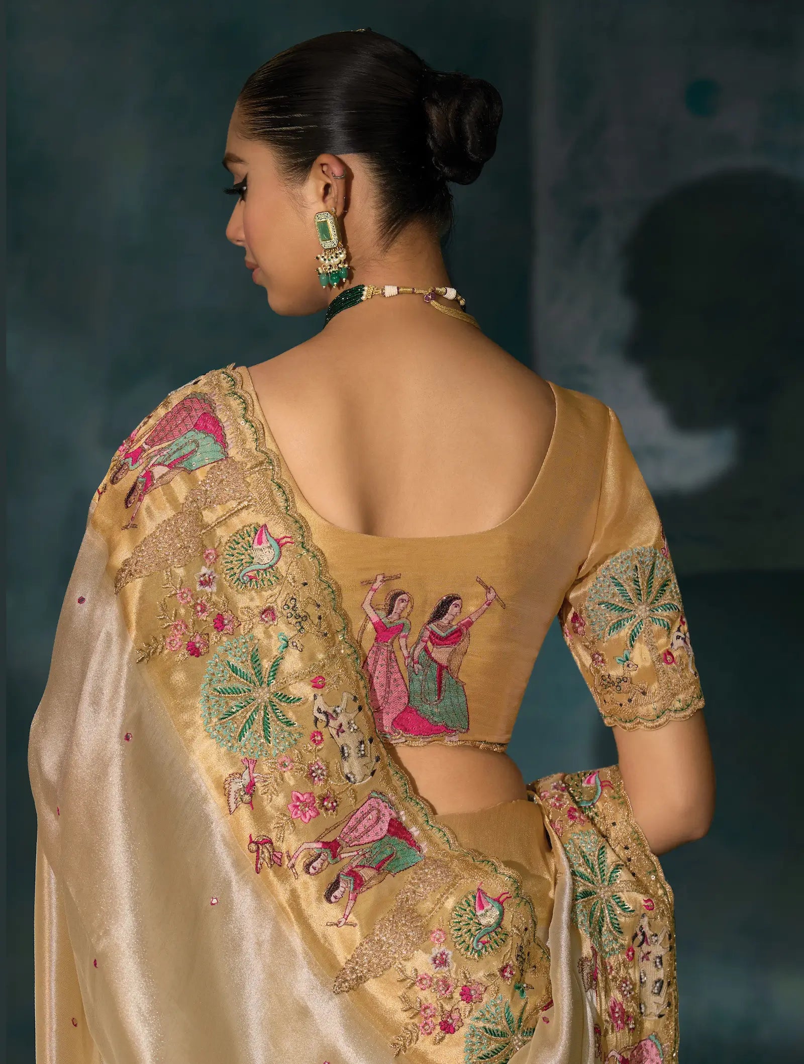 Shiney Beige Heavy Embroidery & Hand Work Silk Saree