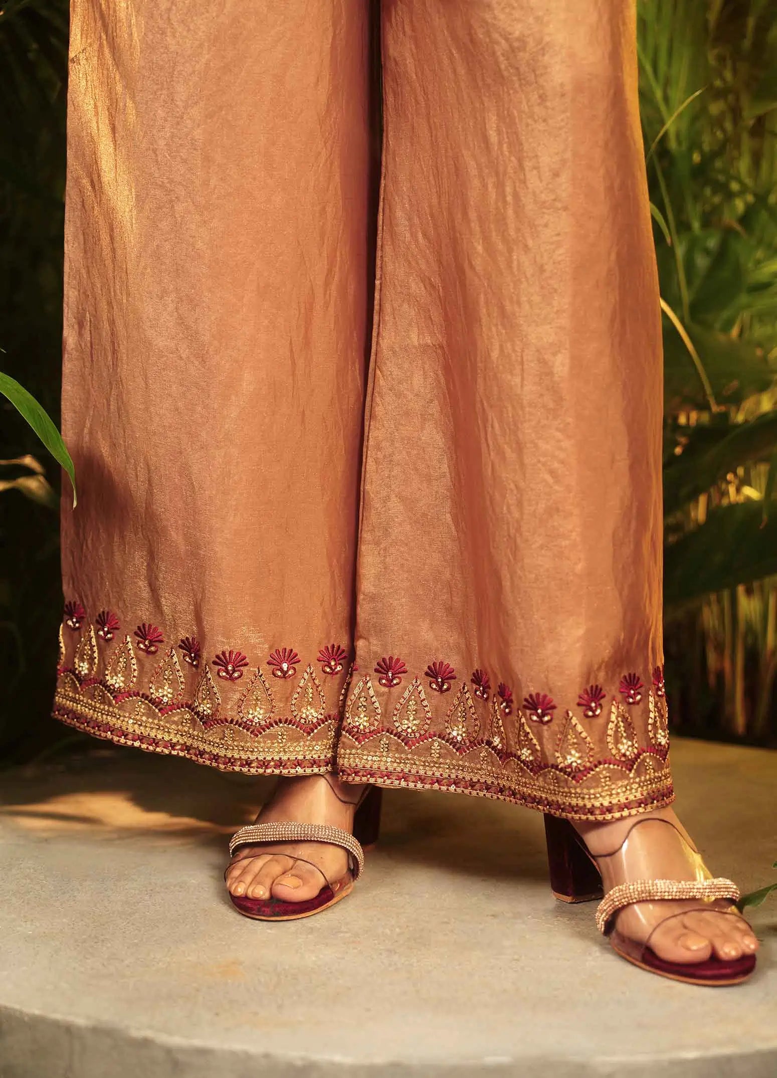 We are launching a stylish new co-ord set crafted in premium Fendi silk. The top features elegant sequins embroidery velvet patch. The bottom is designed with matching dori and sequins detailing, creating a beautifully coordinated and luxurious look perfect for any special occasion.