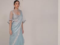 Sky Satin Silk Ready To Wear One Minute Saree With Heavy Handwork Blouse