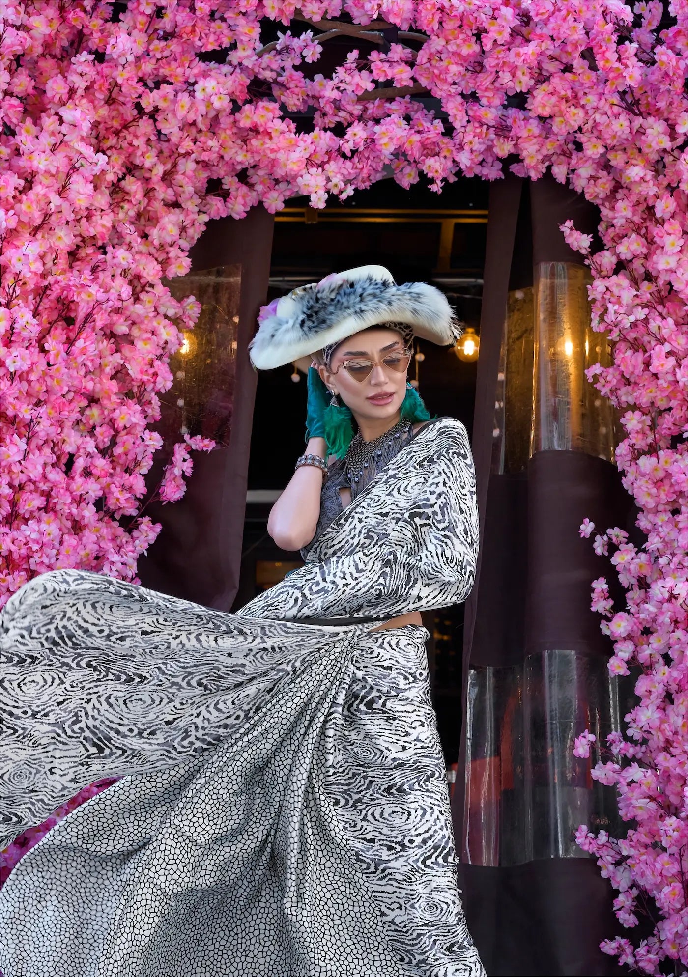 Elegant slate blue-white satin crepe saree adorned with refined digital prints. Paired with a matching digital print blouse in the same fabric for a coordinated, modern ethnic look.