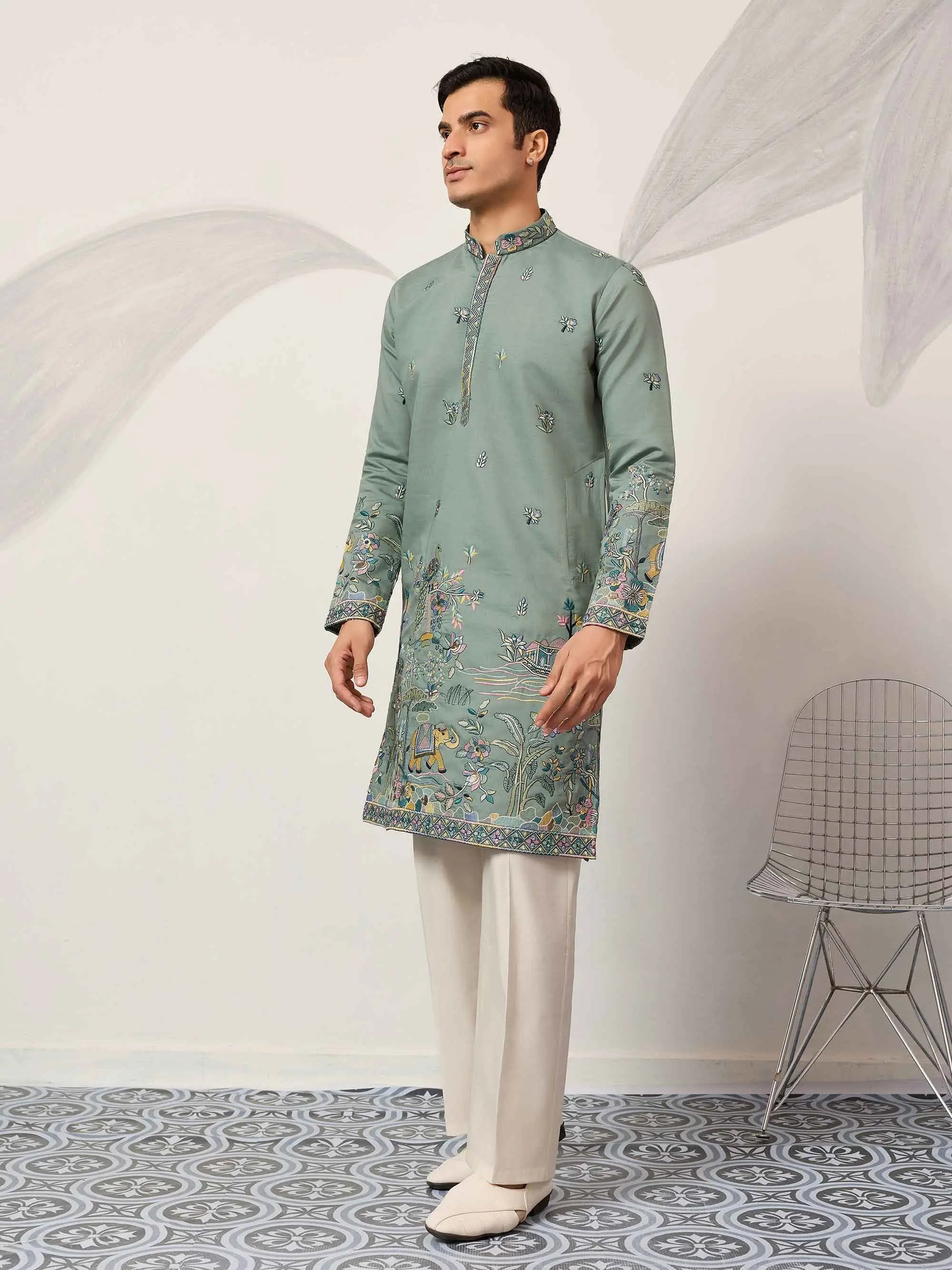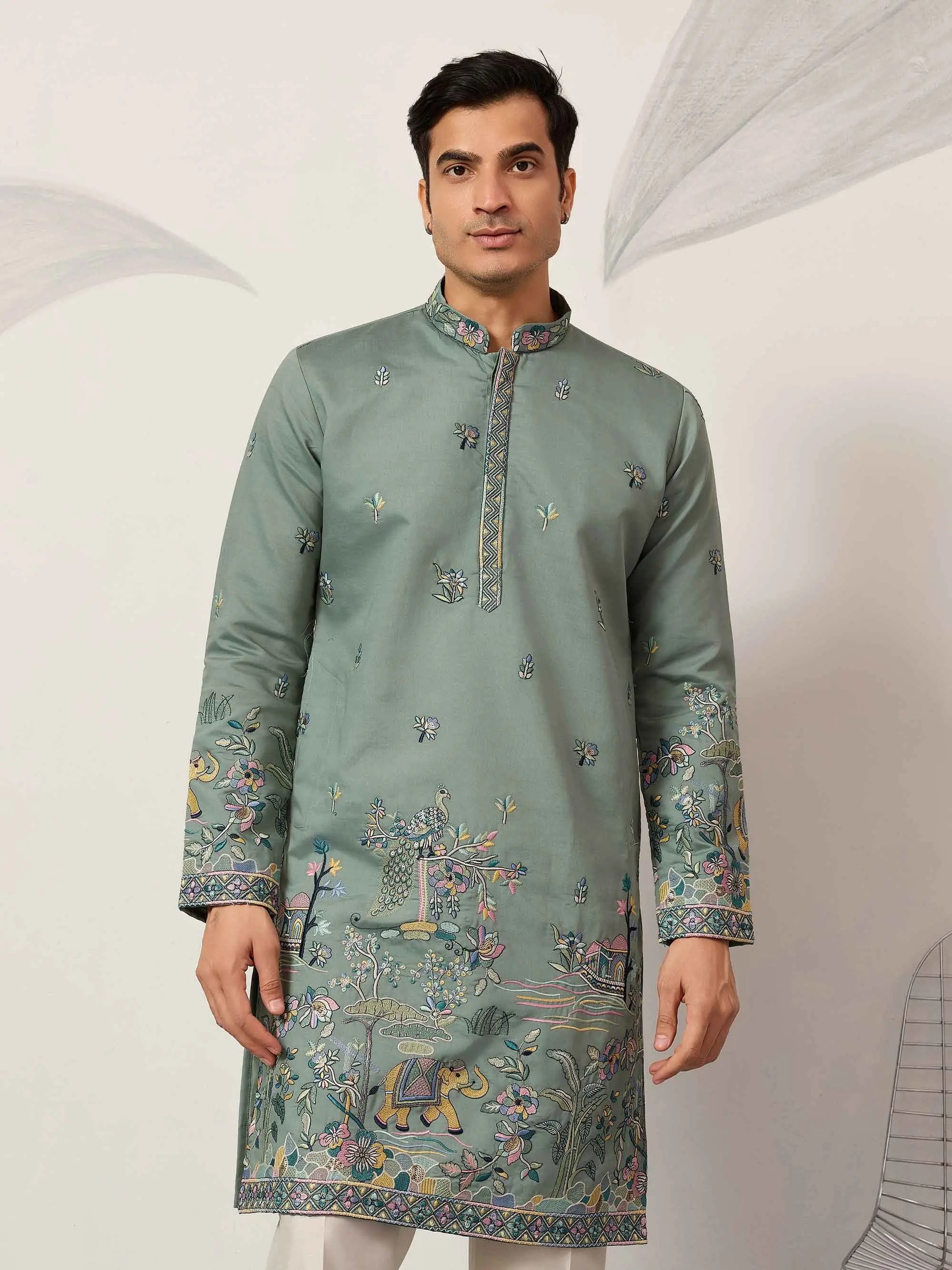 Celebrate Festivals in style with our new men’s kurta set. The kurta, crafted in luxurious viscose silk, features intricate thread, sequins embroidery work, paired with comfortable silk pants—perfect for festivals, parties, and traditional occasions.