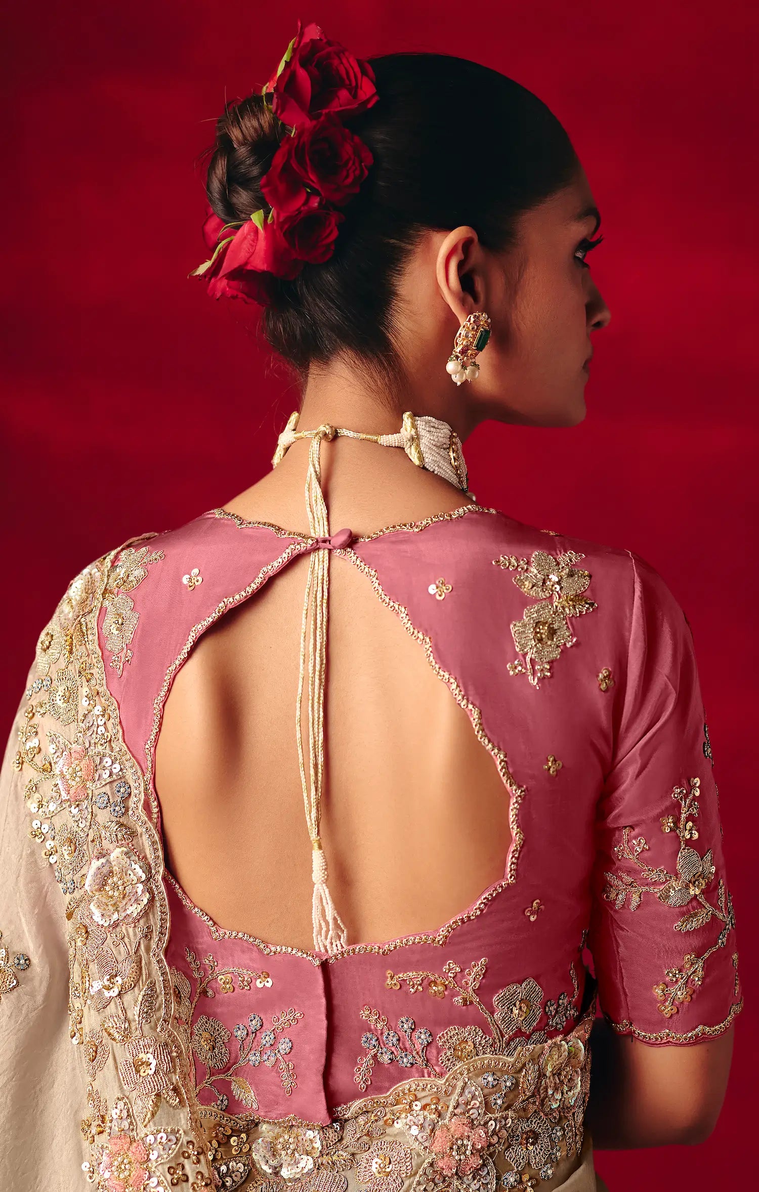A stunning taupe beige saree in fancy fabric, richly adorned with heavy embroidery, handwork & graceful border. Paired with a contrasting rose pink blouse for a luxurious festive look.