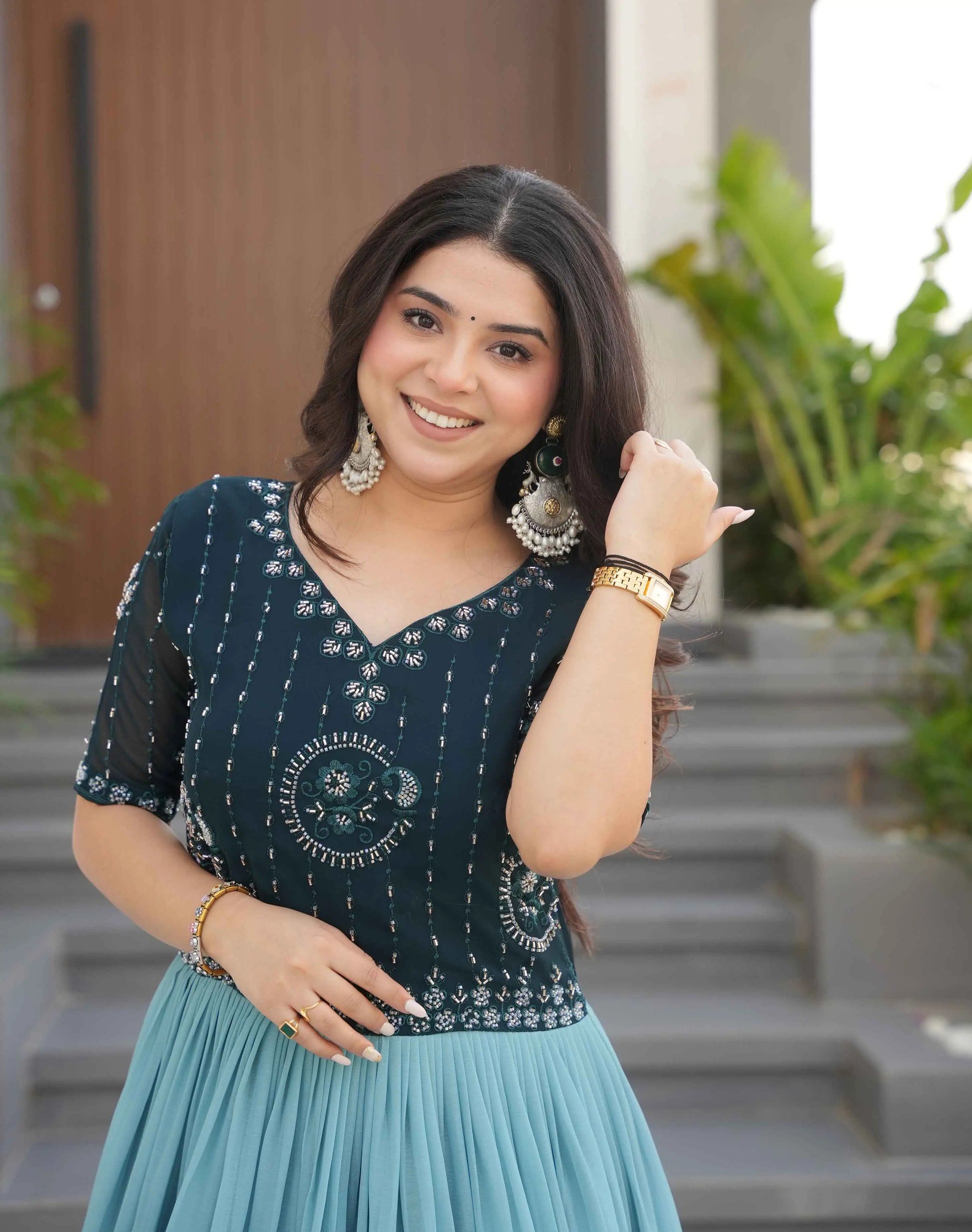 Our Unique Gown Collection is designed to make a statement. Crafted from faux blooming fabric. Vibrant beads embroidery work and a floral print add a touch of elegance. Perfect for weddings, festivals, or any special occasion, this collection blends style with ease effortlessly.