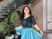 Teal Blue Floral Padding Digital Print Gown With Beads Embroidery Work