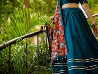 Celebrate The spirit of Navratri with our Pure Cotton Lehenga Set. Featuring elegant Gotta Patti lace details, a mirror handwork blouse, and a floral print dupatta, this ensemble is perfect for festive garba nights. Dance in comfort and style!