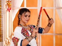 Embrace the festive glow with our Navratri lehenga, crafted in soft viscose cotton. Featuring intricate kutchi patchwork with frill pattern, it comes paired with a matching blouse and a dupatta. A perfect blend of tradition and elegance for Garba nights!