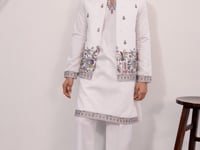 Unveiling our latest men’s wear ensemble crafted in luxurious silk. The koti showcase thread sequins embroidery, paired with matching pant. Ideal for festive celebrations and cultural evenings, this outfit radiates classic sophistication with a modern touch.