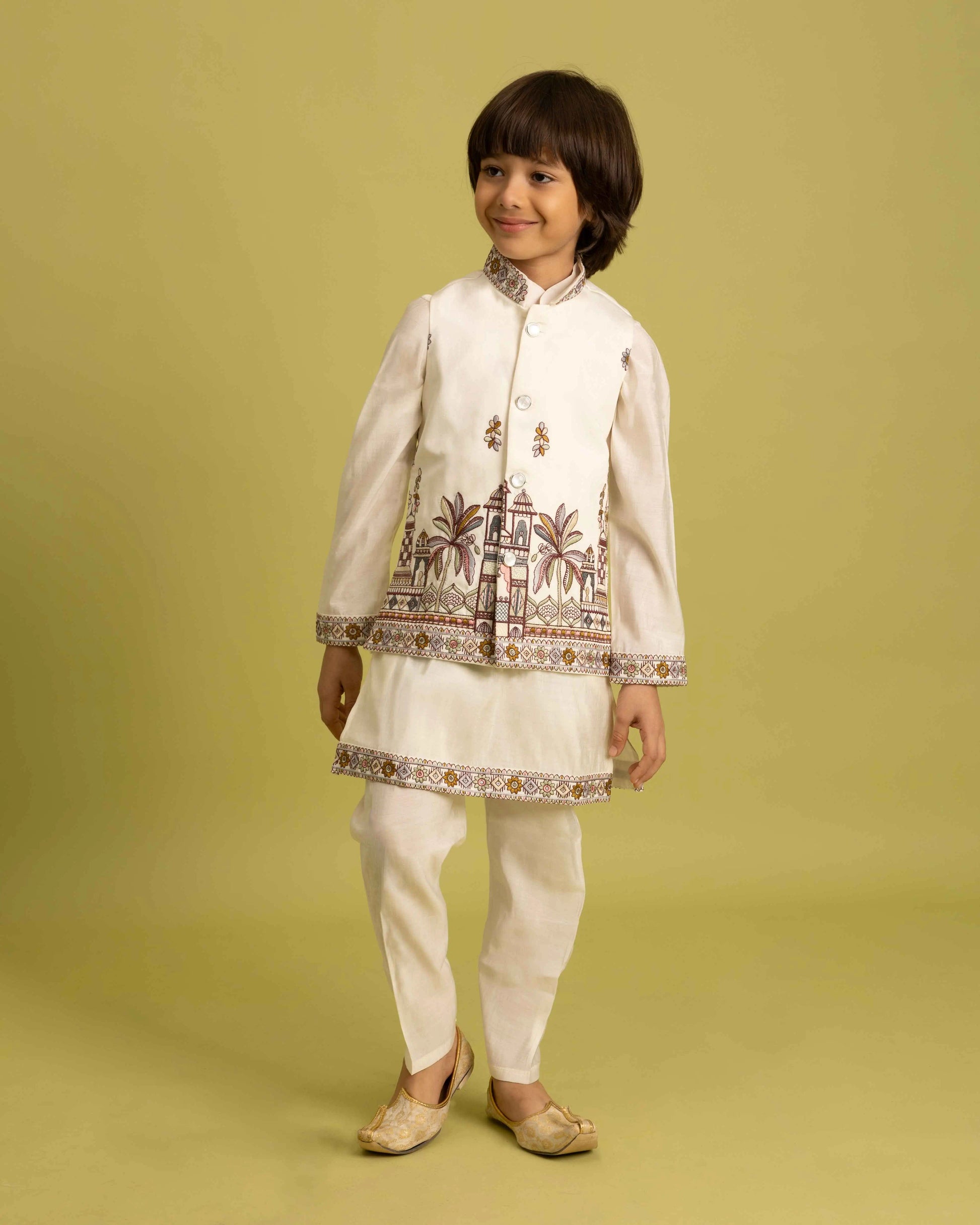 Presenting our new kid’s wear collection in premium viscose silk. The jacket and kurta features intricate thread sequins embroidery. Paired with matching pant--Perfect for weddings, cultural events, parties, and musical nights, this outfit exudes timeless elegance.