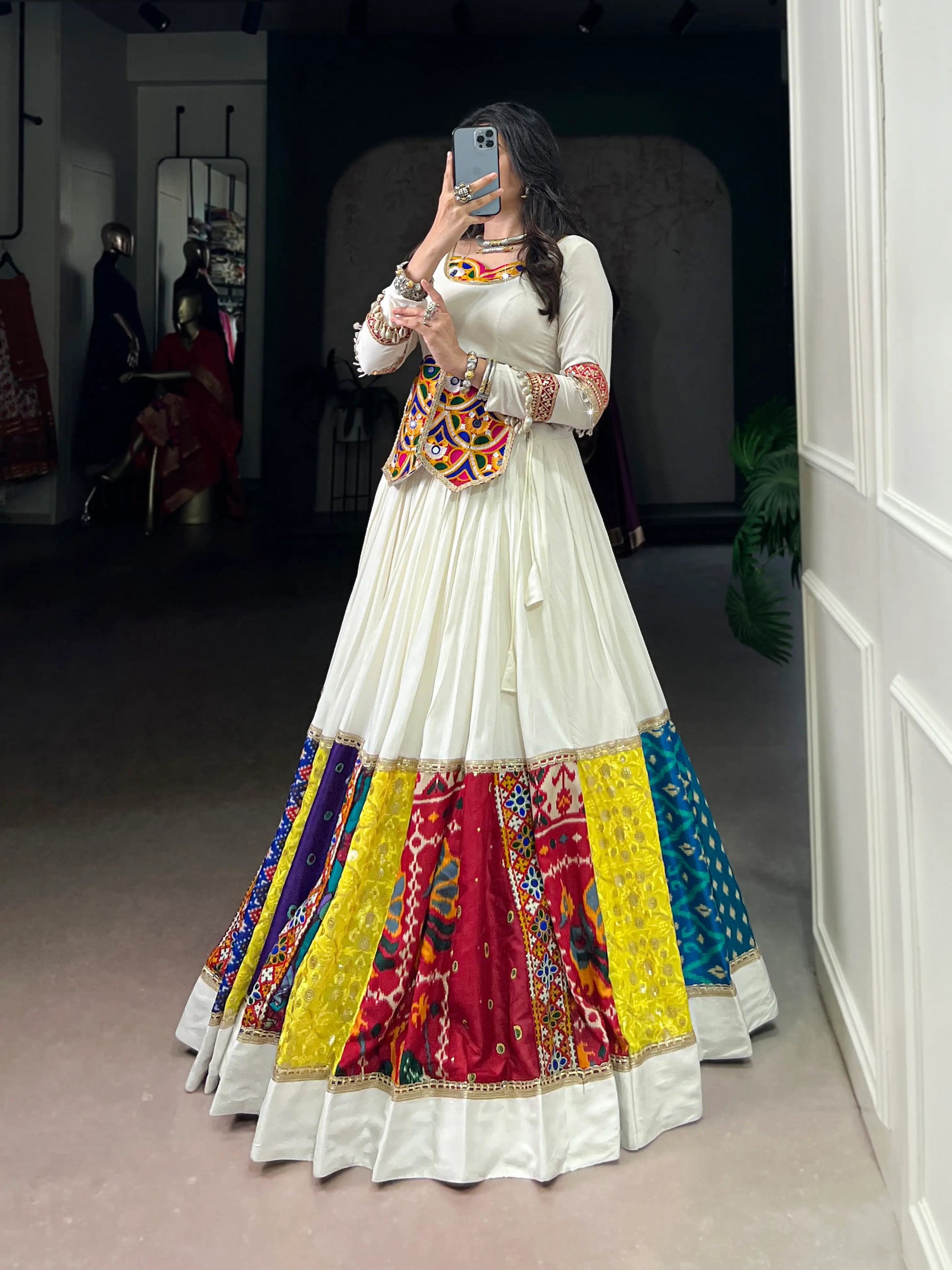 This white multicolor rayon lehenga features vibrant patchwork with lace touch-ups. The blouse stands out with intricate mirror Gamthi work and sequins lace detailing, adding sparkle to the look. A perfect Navratri outfit for style and tradition.