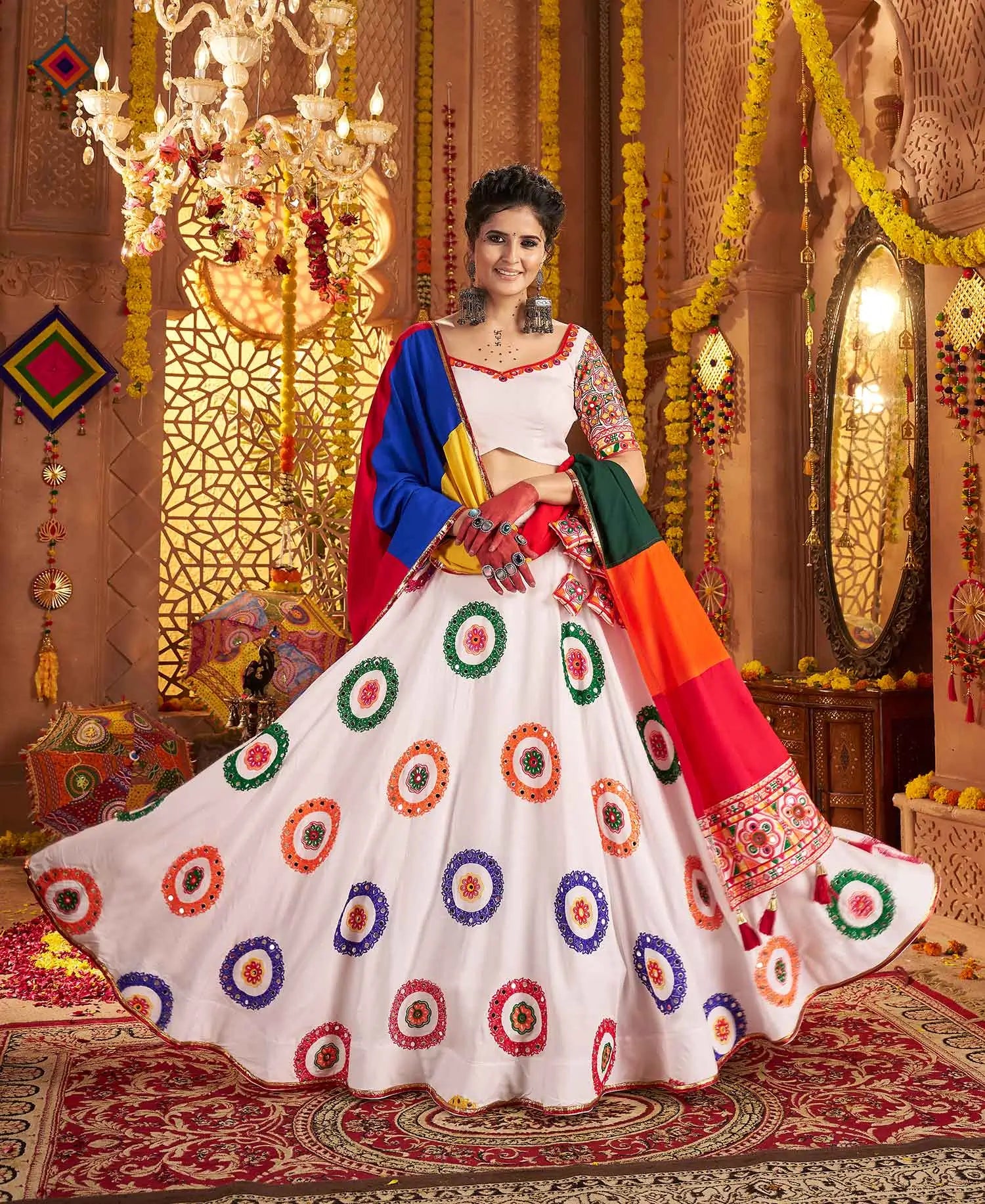 White Navratri Lehenga With Embroidery & Mirror Work With Colorful Dupatta
