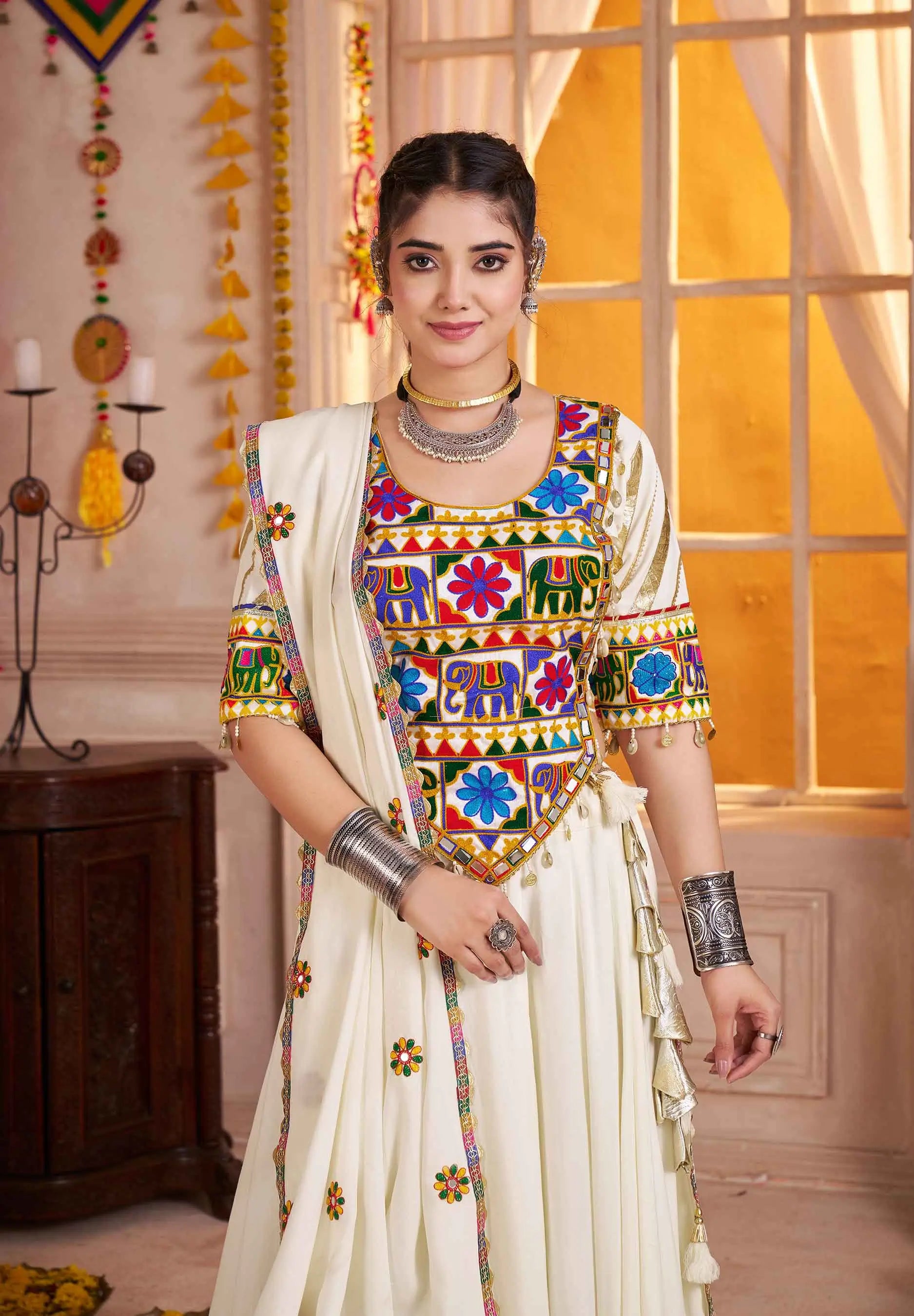 White Navratri Lehenga With Kutchi Work And Mirror Kodi Work Trendy Blouse